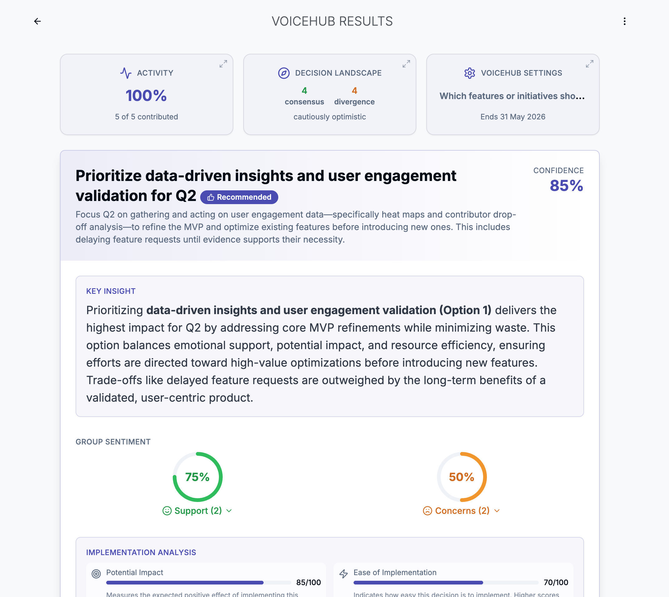 VoiceHubs gives you instant insights, alignment, and confidence you need to move forward.